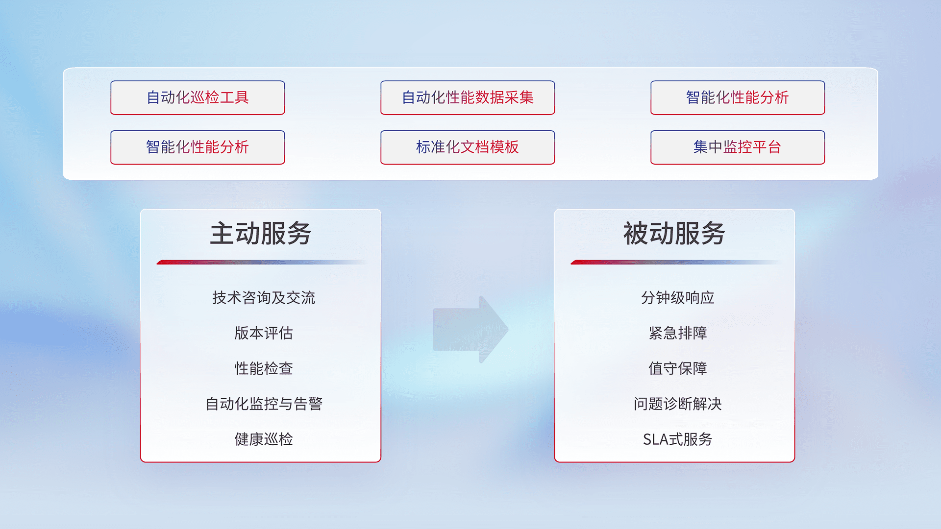 智能化工具和标准化文档,,,保障服务质量,,,提供主动服务(包含技术咨询、、版本评估、、、、性能检查、、、自动化监控与告警、、健康巡检)和被动服务包含(分钟级响应、、紧急排障、、值守保障、、、问题诊断解决、、SLA服务)。。。